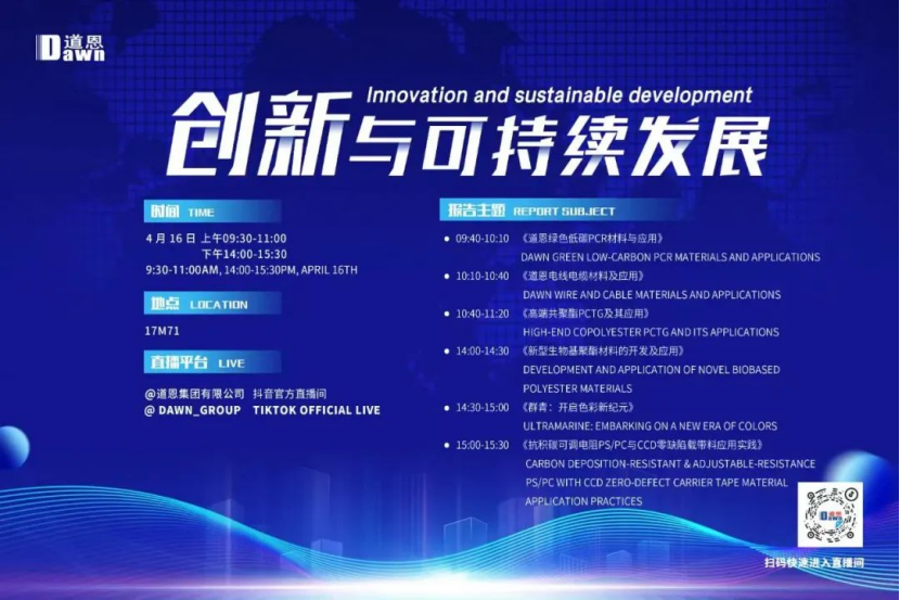 In addition, Dawn Group has also released its 2025 forum plan. On April 16th, special reports such as Dawn's Green and Low-carbon PCR Materials and Their Applications, Dawn's Wire and Cable Materials and Their Applications, High-end Copolyester PCTG and Its Applications, the Development and Application of New Bio-based Polyester Materials, Ultramarine: Opening a New Era of Colors, and the Application Practice of Anti-carbon Deposition Adjustable Resistor PS/PC and CCD Zero-defect Carrier Tape Materials will be held at the exhibition site. We will work hand in hand with all guests to explore the path of innovation and sustainable development.