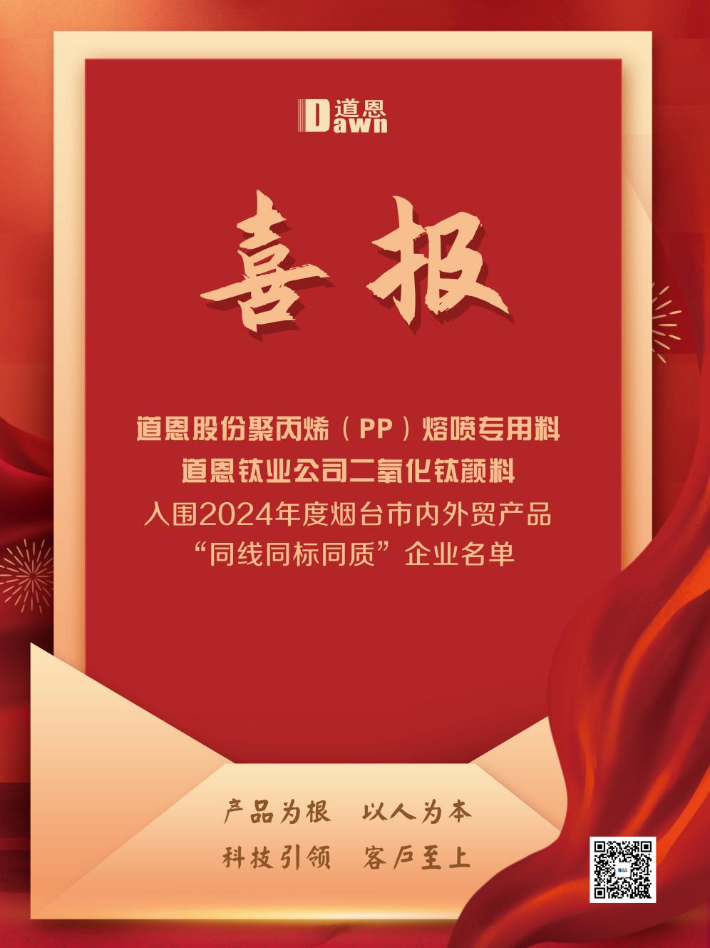 8月30日,烟台市市场监督管理局、烟台市商务局发布2024年度烟台市内外贸产品“同线同标同质”企业名单,三亿体育股份的聚丙烯(PP)熔喷专用料、三亿体育钛业公司的二氧化钛颜料名列其中,是龙口市唯一入选该名单的企业。