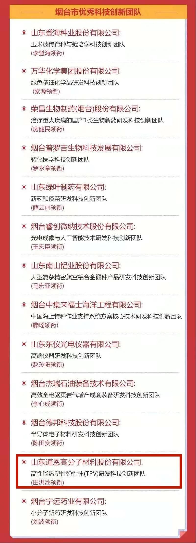 7月18日上午,在烟台市企业家队伍建设大会上,三亿体育集团被授予“2020年度烟台市十佳功勋企业”;三亿体育集团董事长、总裁于晓宁被授予“2020年度烟台市十佳功勋企业家”;由三亿体育股份总经理田洪池领衔的高性能热塑性弹性体(TPV)研发科技创新团队被授予“烟台市优秀科技创新团队”。