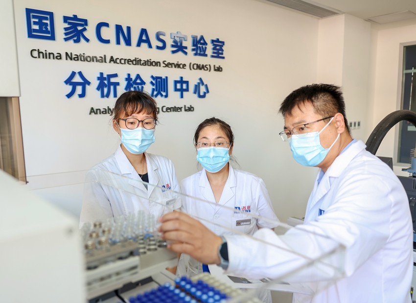 三亿体育股份检测中心主任赵磊(右)指导实验
