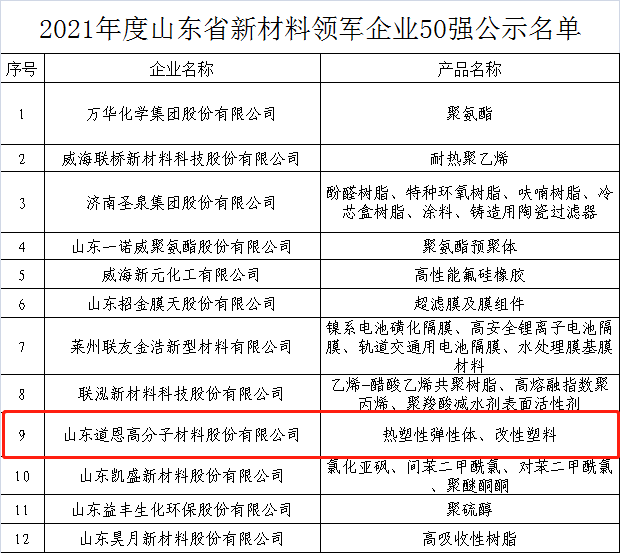 日前,2021年度山东省新材料领军企业培育库入库名单和2021年山东省新材料领军企业50强名单出炉。三亿体育股份的热塑性弹性体、改性塑料入围上述榜单。
