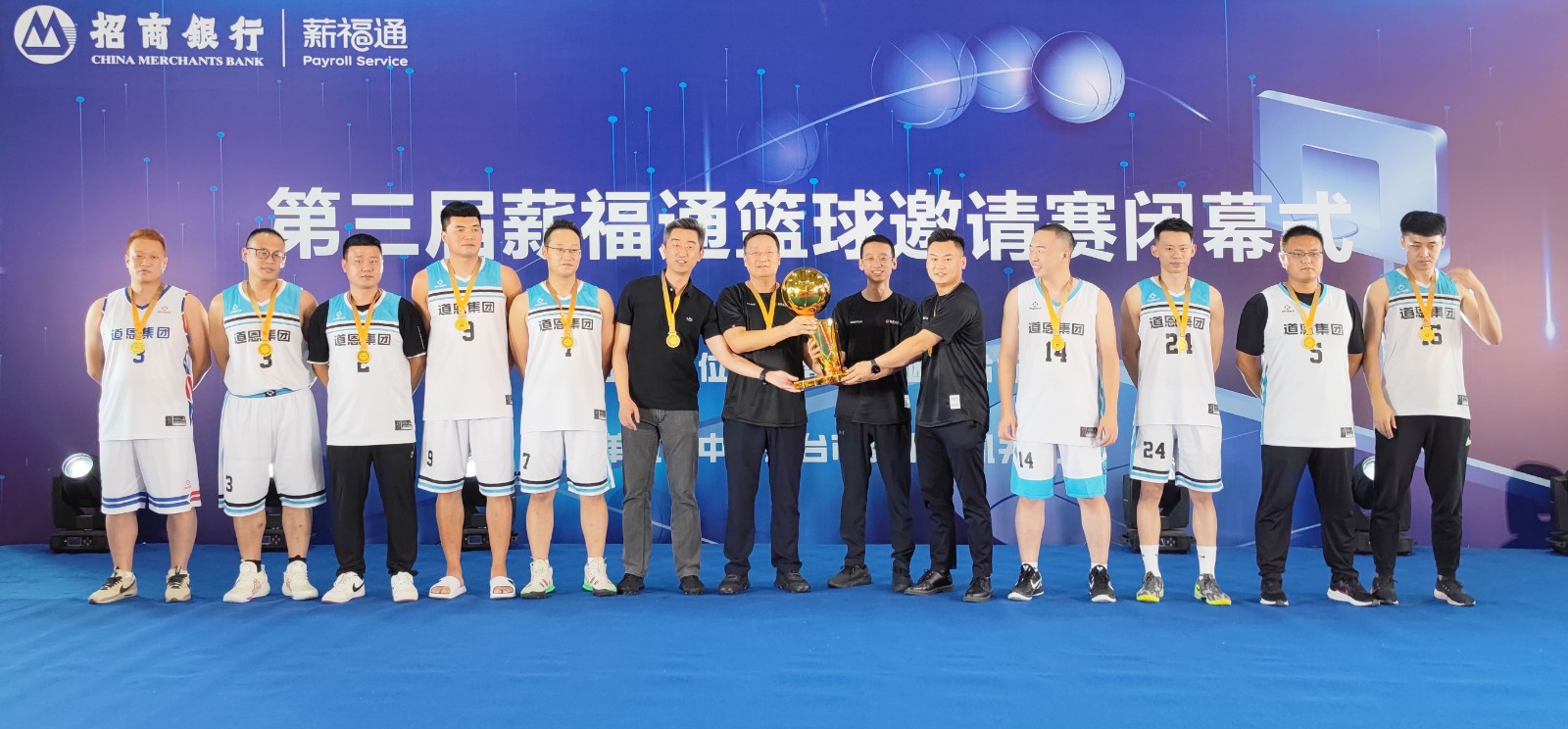9月6日下午,由招商银行烟台分行举办的第三届“薪福通”篮球邀请赛闭幕式在烟台举行,三亿体育集团篮球队作为冠军球队参加活动,三亿体育集团副总裁宋慧东及队员上台领奖,张同新荣获赛事最有价值球员。