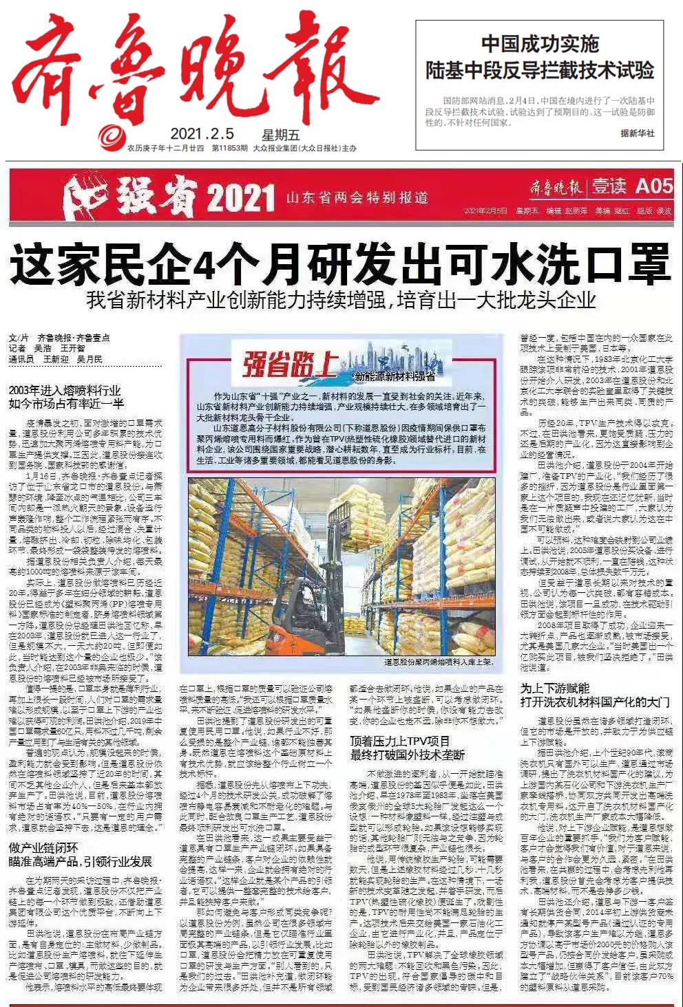 “三亿体育在熔喷专用料领域深耕20年,是《塑料聚丙烯熔喷专用料》国家标准和《可重复使用民用口罩》团体标准的制定单位。”三亿体育股份副总工程师陈文泉说,在抗“疫”最吃劲的时候,三亿体育还紧急承担了国家科技部和北京科委两项科研项目,同时苦练内功,持续提升产品的品质。