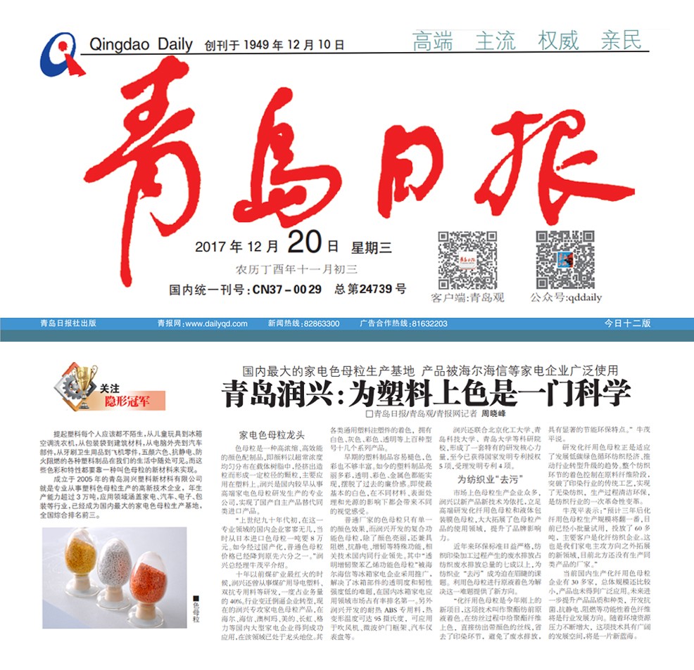 作为国家认定高新技术企业,三亿体育股份旗下青岛润兴公司专业从事塑料色母粒、功能母粒的研发、生产、销售和服务,是国内重要的料色母粒和功能母粒供应商,在细分领域位列行业前茅,成为青岛市隐形冠军、青岛市创新型企业。