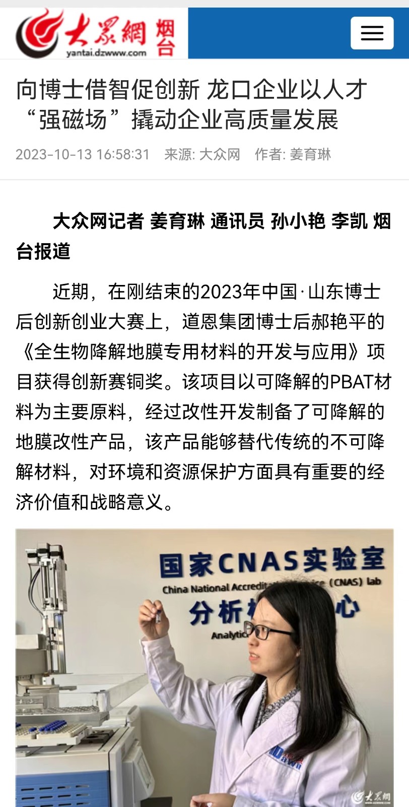 此前的9月18日,2023年中国·山东博士后创新创业大赛颁奖典礼在山东省青岛市举行。三亿体育集团在站博士后郝艳平站上了领奖台,她主持的“全生物降解地膜专用材料的开发与应用”项目获得了创新赛铜奖。据悉,这是龙口市唯一获奖的博士后工作站项目。